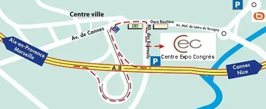 Un minibus réservé aux visiteurs du Salon fera gratuitement la navette toute les 15 minutes entre la Zone des Tourrades (Avenue Maréchal de Lattre de Tassigny, Arrêt Canardière-Tassigny - entre Boulanger & Lidl) et le Centre Expo Congrès de Mandelieu.